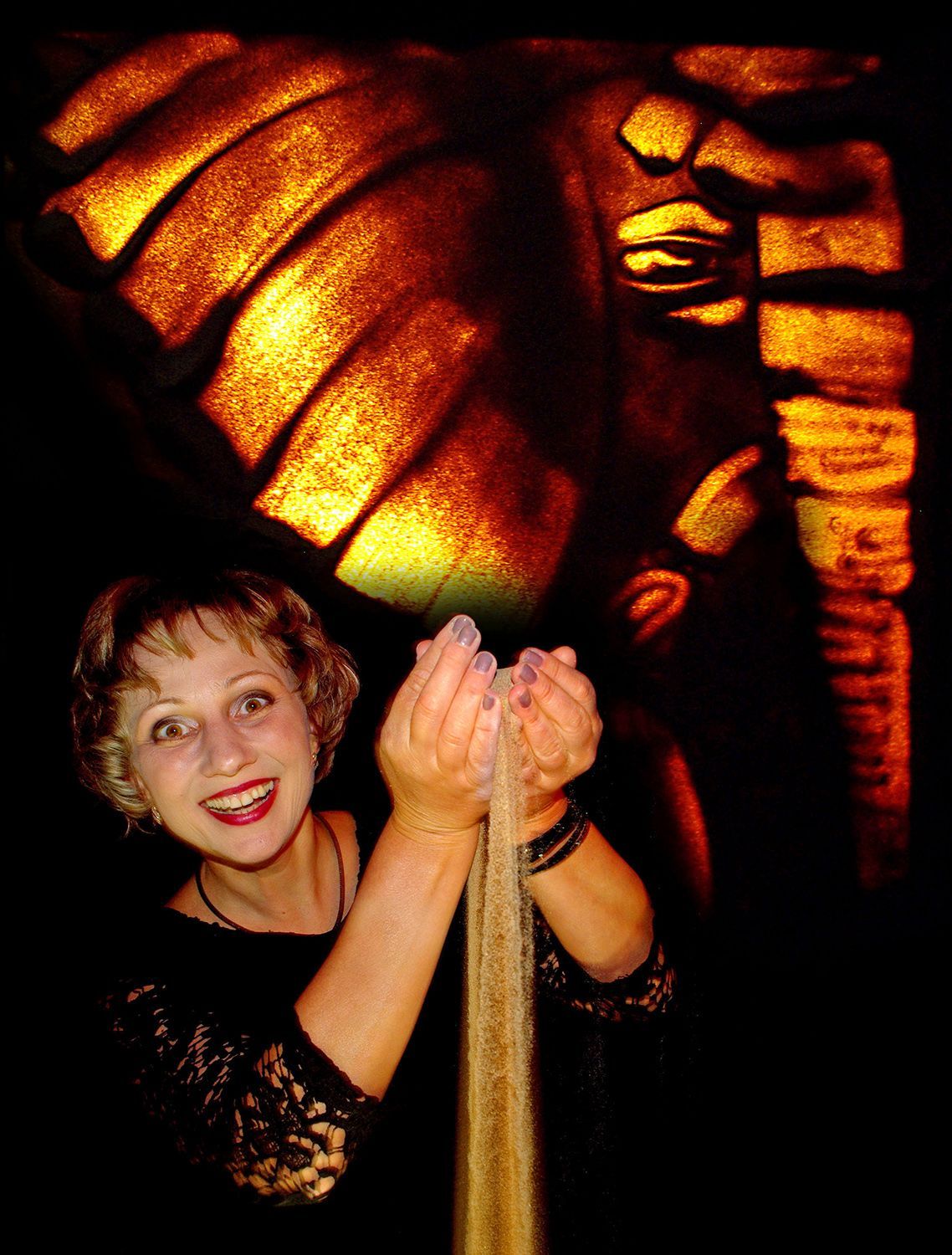 Die professionelle Sandkünstlerin Iryna erschafft live auf der Bühne faszinierende Bildwelten, die fließend ineinander übergehen und sich zu einer berührenden Geschichte verbinden. Mit sicherer Hand und beeindruckender Präzision entstehen aus feinem Sand emotionale Szenen –vergänglich im Moment und doch nachhaltig im Eindruck. Eine Kamera überträgt den kreativen Prozess in Echtzeit auf eine große Leinwand, sodass Ihr Publikum jeden Augenblick hautnah miterleben kann.